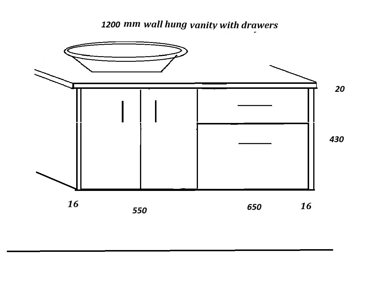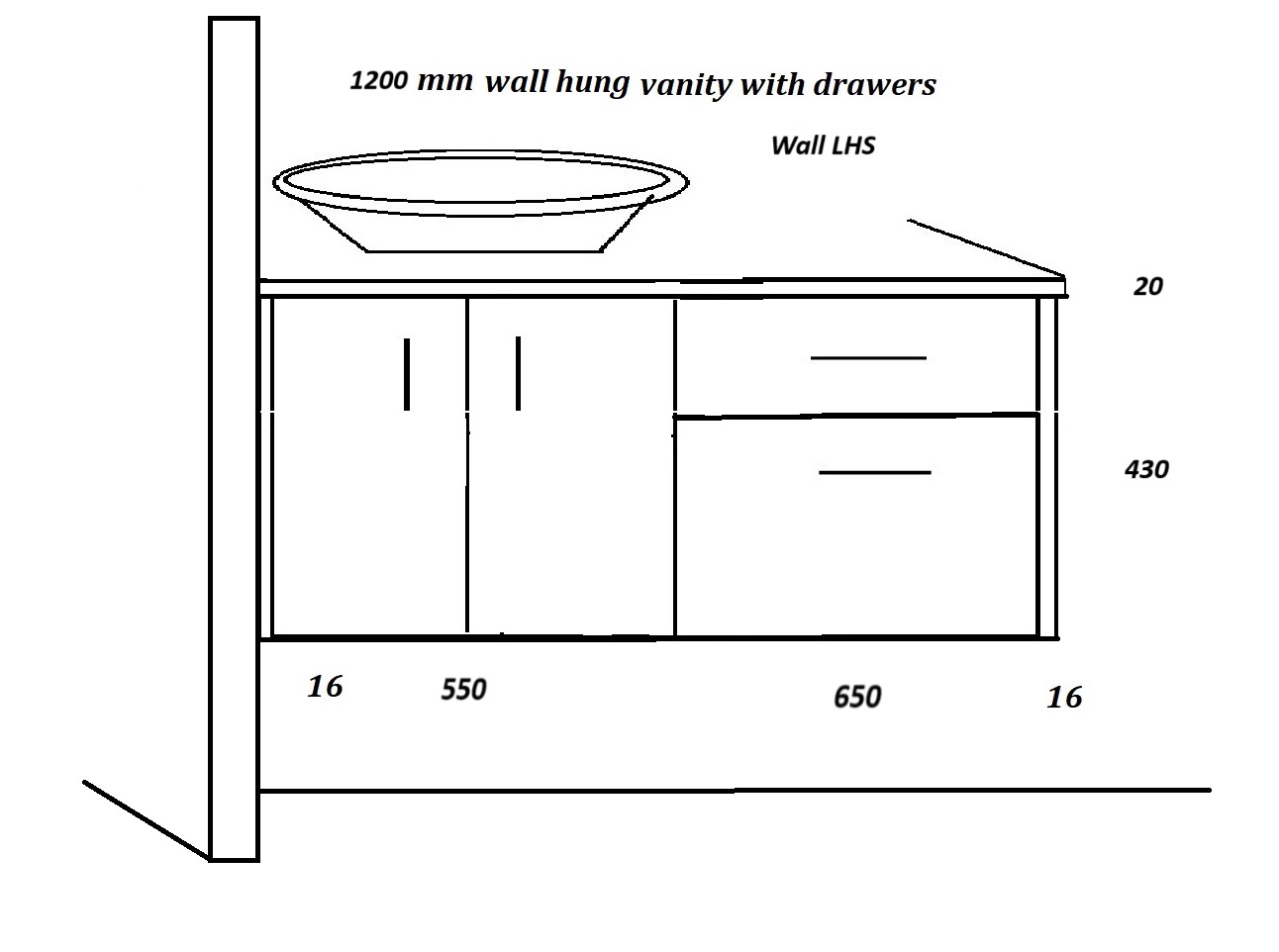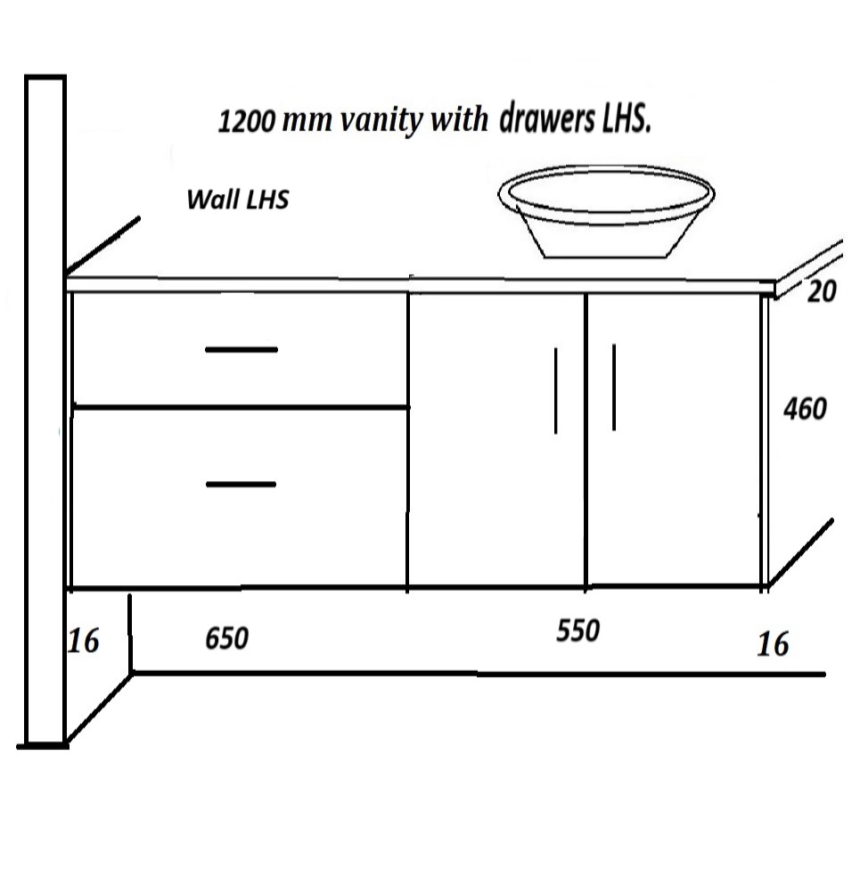 Wall vanities 1150 mm, wide drawers left.