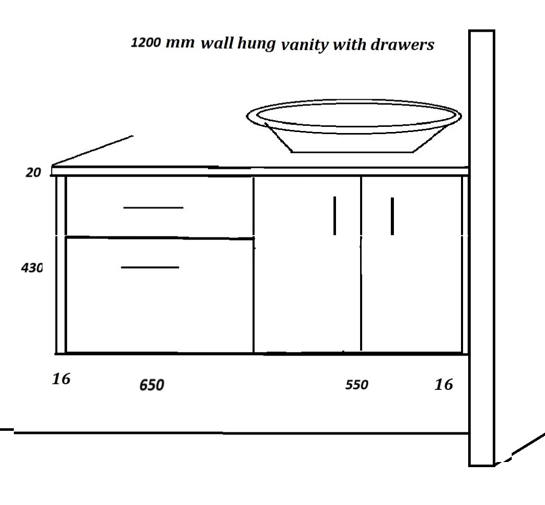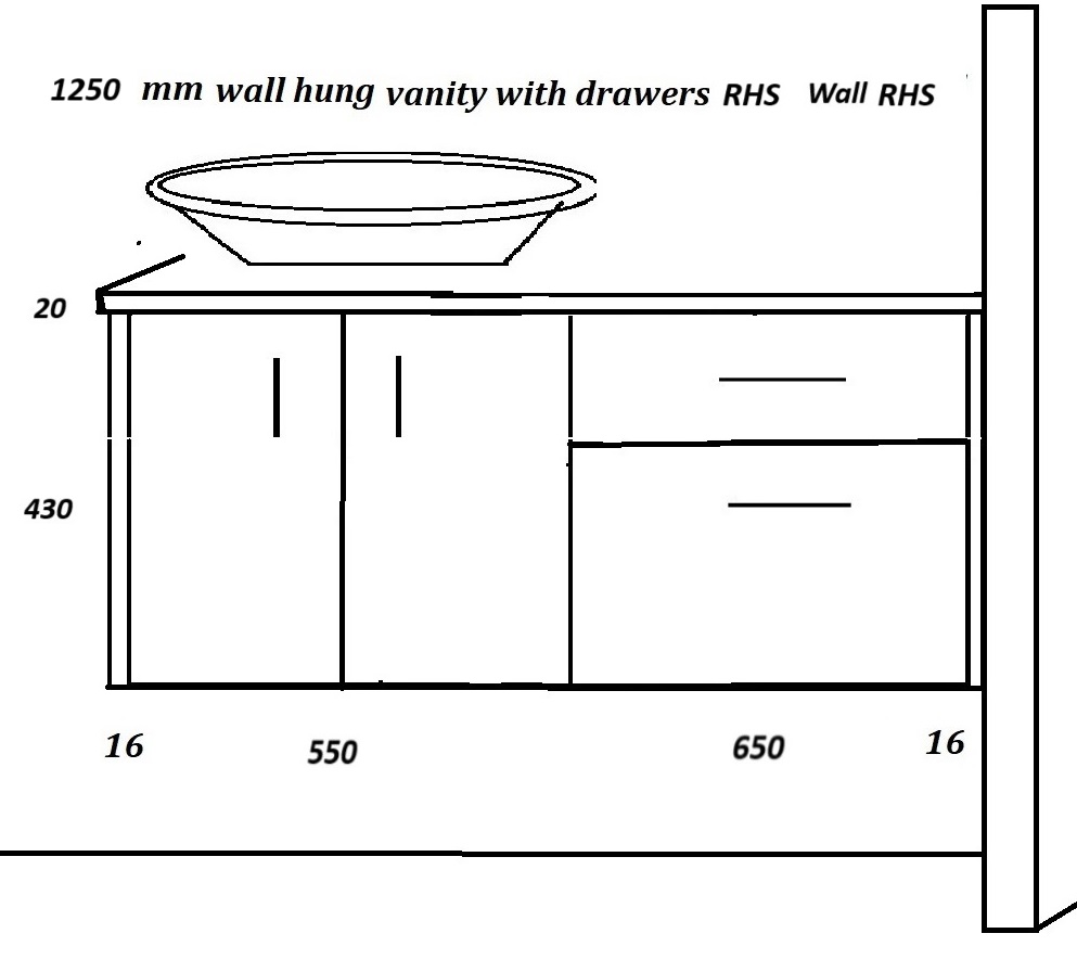 Wall vanities 1150 mm, wide drawers right.