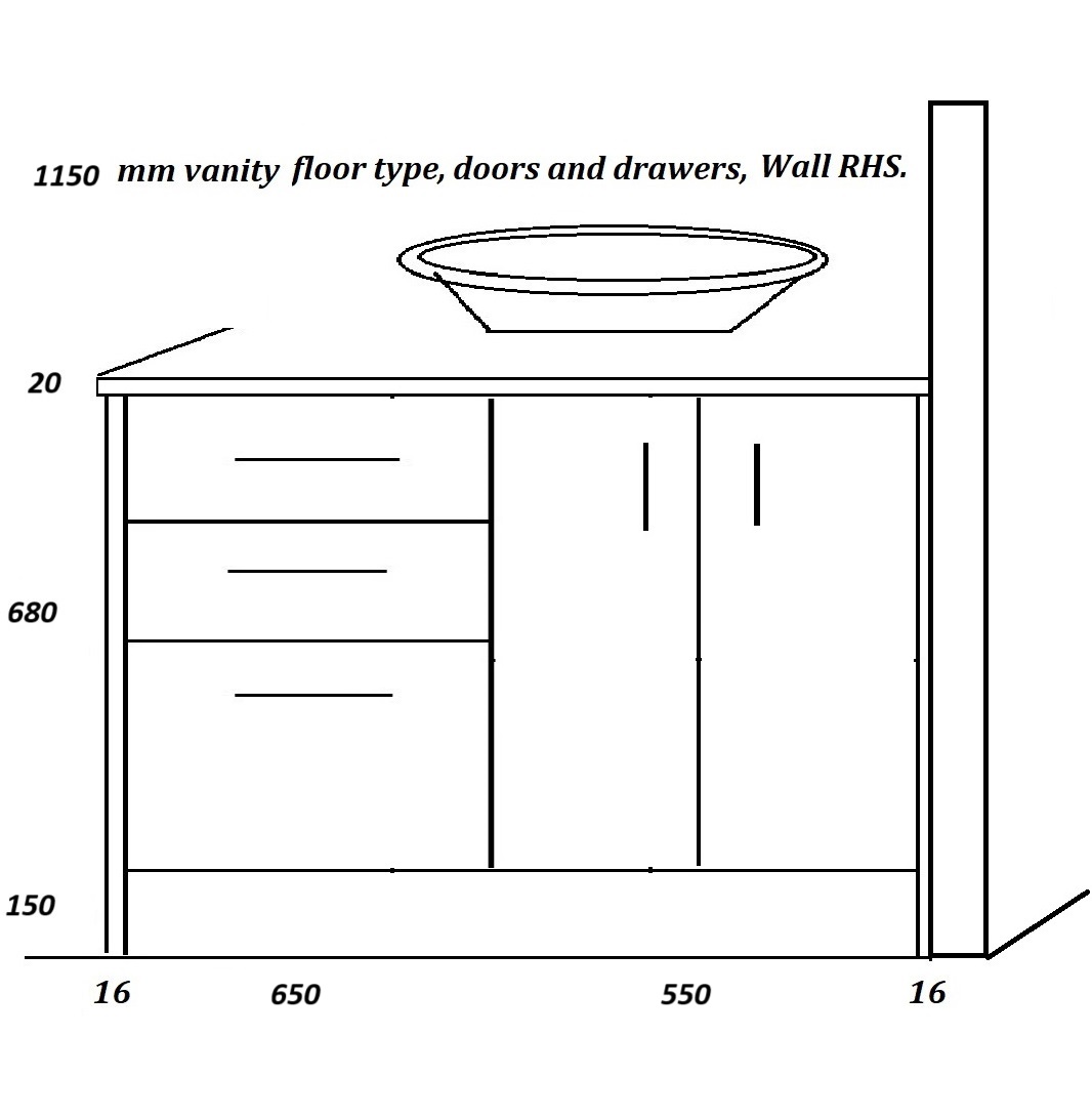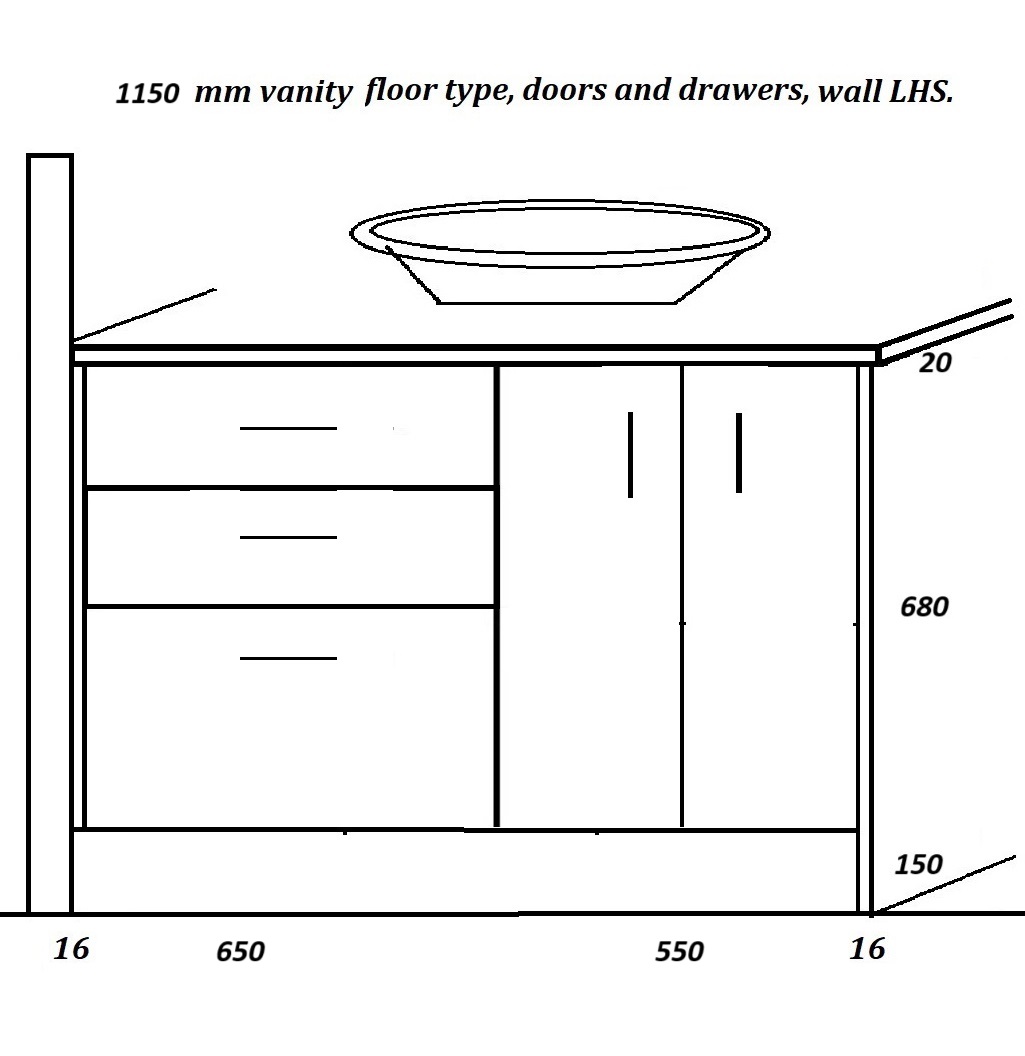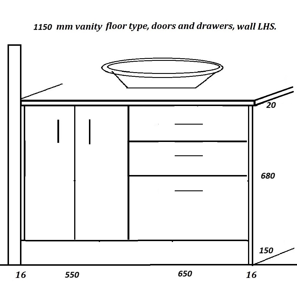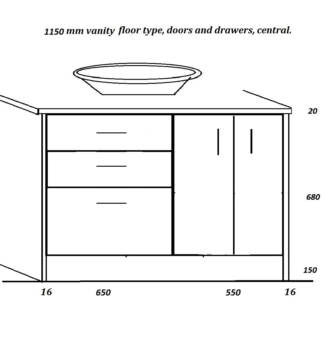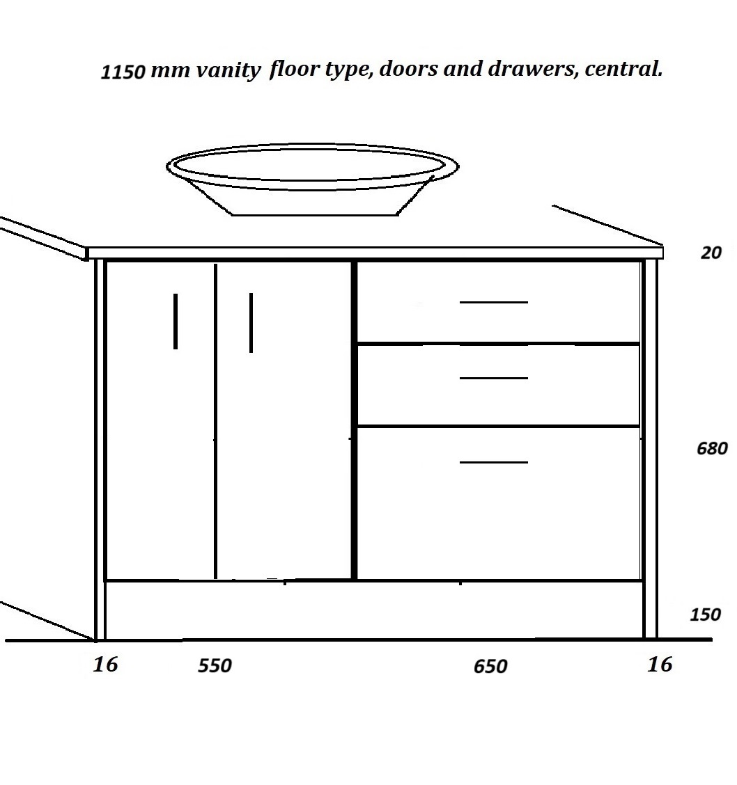 Floor vanities 1150 mm, wide drawers left.