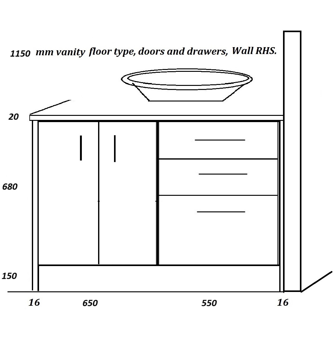 Floor vanities 1150 mm, wide drawers right.